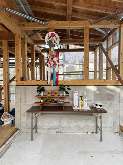 上棟式では代表あいさつの後、ここまでの工事が無事終えたことへの感謝と今後の安全を祈願する神事を執り行いました。